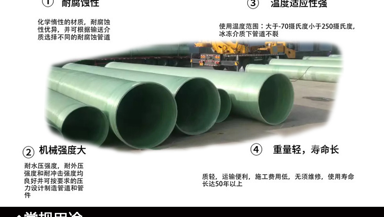 構(gòu)成材料:玻璃鋼夾砂管的主要材料為不飽和聚酯樹(shù)脂、無(wú)堿無(wú)捻玻璃纖維和天然圓角石英砂。不飽和聚酯樹(shù)脂采用 國(guó)內(nèi)著名生產(chǎn)廠家的產(chǎn)品,其酸值、工藝浸潤(rùn)性、澆鑄體斷裂韌 性和強(qiáng)度等指標(biāo)均處于國(guó)內(nèi)領(lǐng)先水平;無(wú)堿無(wú)捻玻璃纖維采用了先進(jìn)的池 窯拉絲生產(chǎn)技術(shù),使用最佳的表面處理劑,因此,其拉伸強(qiáng)度、耐磨性、表面形態(tài)及其與樹(shù)脂的融合程度均十分理想;石英 砂采用內(nèi)蒙古草原的天然圓角石英砂,經(jīng)水洗、烘干和篩選等工藝過(guò)程后得到符合理想級(jí)配的產(chǎn)品,其形狀、成份和潔凈 度使天然圓角石英砂具有浸潤(rùn)性好、堆積密度高、有效地提高玻璃鋼夾砂管強(qiáng)度和剛度等優(yōu)良性能。